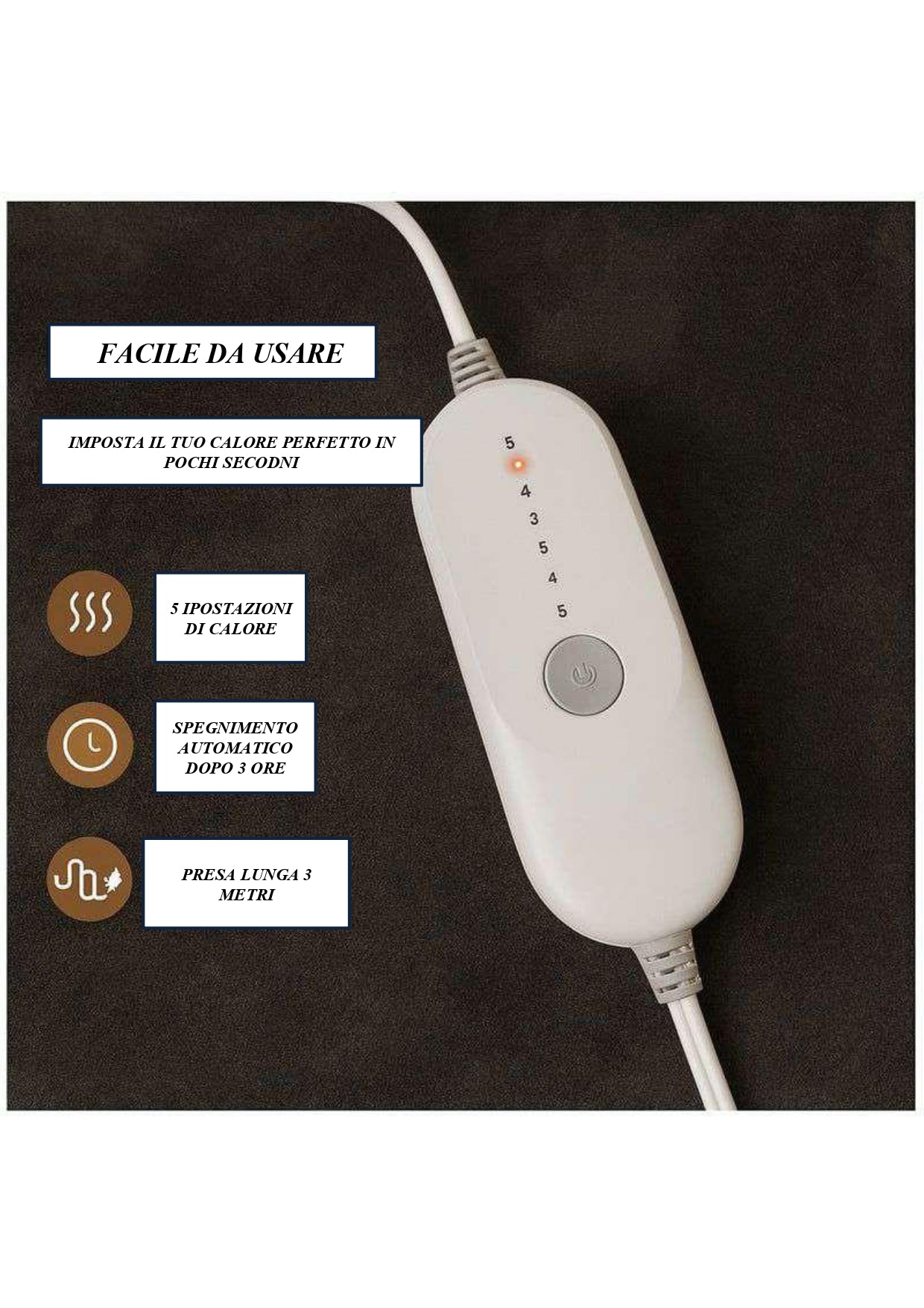Realizzata in fleece ultra-morbido, ti avvolge in calore. Sicurezza totale: si spegne automaticamente dopo 3 ore per evitare surriscaldamento. Riscaldamento rapido e regolabile. Ideale per coccole ovunque